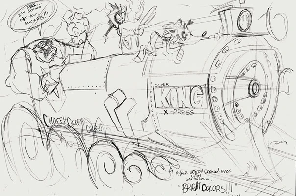 Kong X-Press e la Fabbrica delle Casse: subito dopo la fuga da N.Brio, Crash e Cortex avrebbero trovato lungo la ferrovia un treno, che doveva essere chiamato "Super Kong X-Press" o "N.Brio X-Press" (non avevano deciso che nome dargli), ma in entrambi i casi, il treno doveva essere comandato da Koala Kong, che era alla guida. Sarebbe così iniziata una mini-battaglia boss contro di lui e allo stesso tempo N.Brio, versione rana, cominciava a divorare il treno. La battaglia doveva finire con la sconfitta del duo malvagio e l'arrivo di Crash e Cortex alla "Fabbrica delle Casse", dove venivano create tutte le casse dell'universo di Crash Bandicoot. Di quest'idea, al contrario della precedente, abbiamo una concept art, la quale mostra il treno soprannominato "Super Kong X-Press". Traduzione del fumetto di Kong: "Grrr, ora vi prendo perdenti!"
