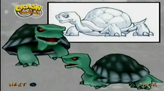Nelle concept art di Crash Twinsanity si può vedere che una tartaruga, diversa da quella presente nella demo, doveva apparire anche nella versione finale, ma alla fine è stata tolta, forse perché la gag della puzzola parlante si è rivelata migliore.