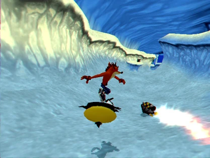 Crash usa Cortex come uno snowboard nel livello "Scivolata sui ghiacciai"
