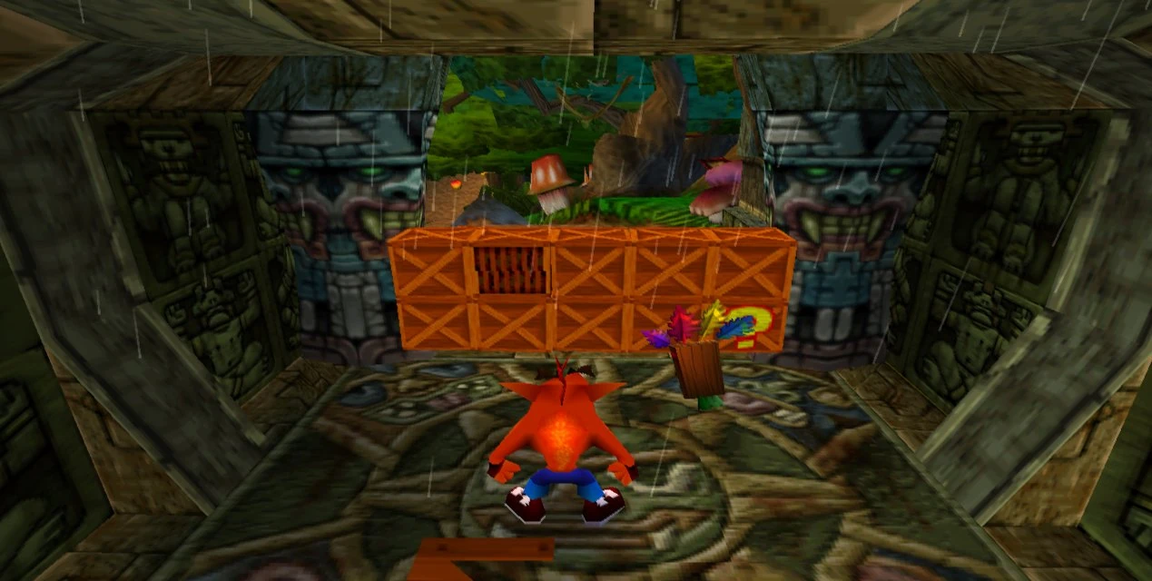 Вернувшись обратно на лесную тропинку и пройдя ещё чуть-чуть, Крэш увидит люк с вопросительным знаком. Это вход в бонус. Чтобы туда попасть, надо просто наступить на люк, после чего он обвалится, и Крэш, собственно, попадёт в бонус, выполненный в том же дизайне, что и скрытая дорожка. Бонус, кстати, довольно лёгкий. Как и на всех остальных бонусах в игре, здесь нет врагов.