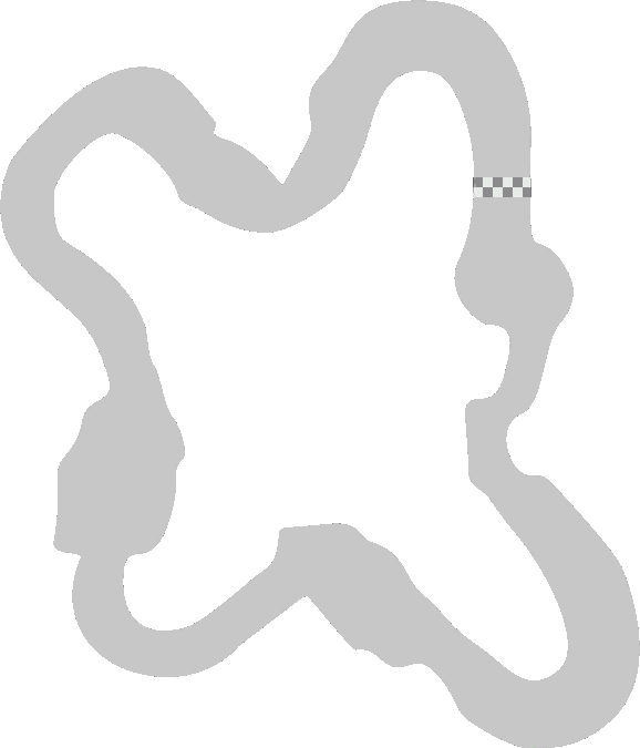 The track begins with brief straight before curving around to the left around a rock formation. Racers can also cut under the overhang here for a small shortcut. The road then turns to the right before curving to the left again, descending down a sequence of short cliffs, like giant steps. The track continues to curve left with a boost pad before encountering a boulder that rolls back and forth across the track, crushing any racers caught underneath. After the boulder is a short series of ridges before emerging onto a frozen lake.