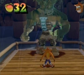 Crunch assisted by Wa-Wa is the second boss of the game. The fight takes place in a swampy environment on a boardwalk over water, where Wa-Wa has transformed Crunch into a being of water. Crunch will add new moves to his attack pattern each time he gets hit. At first he will shoot blue ground waves at Crash which can be simply jumped over. Next he fires green energy waves, which must be crouched under. Finally, Crunch will cause water bubbles to appear in the gaps between platforms, forcing Crash to wait before jumping forward. After being hit four times Crunch is defeated, granting Crash the power of Double Jump.