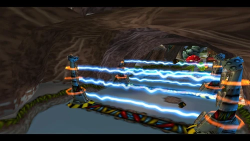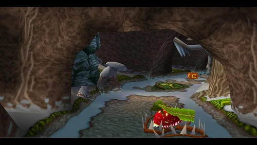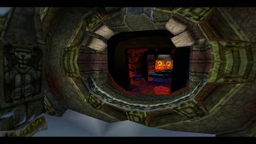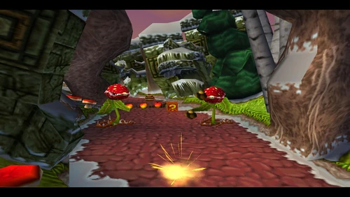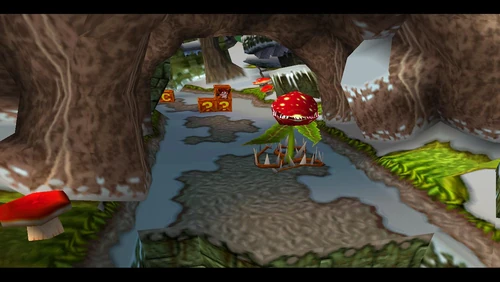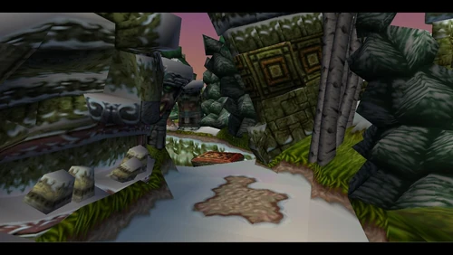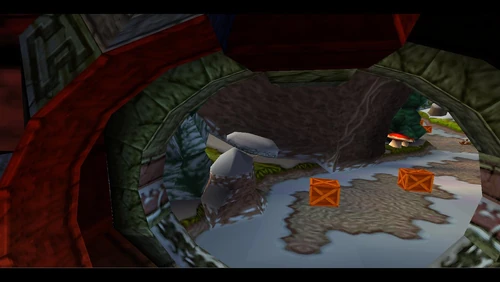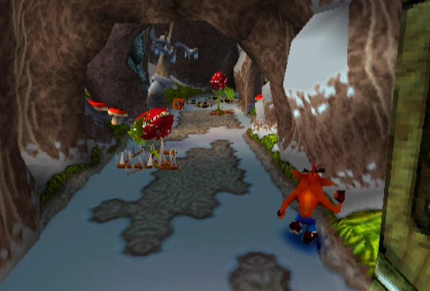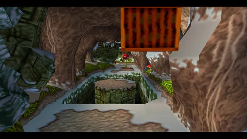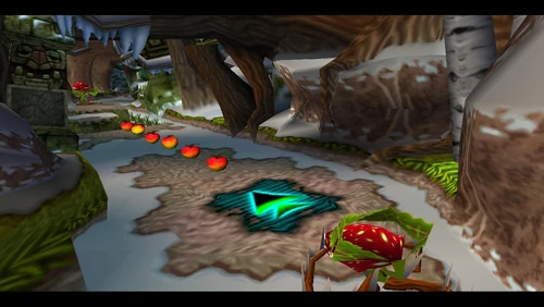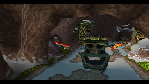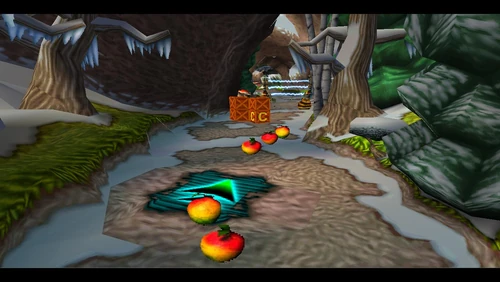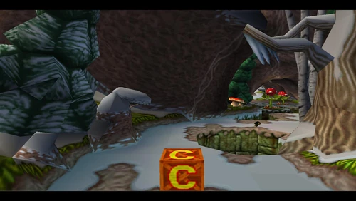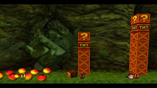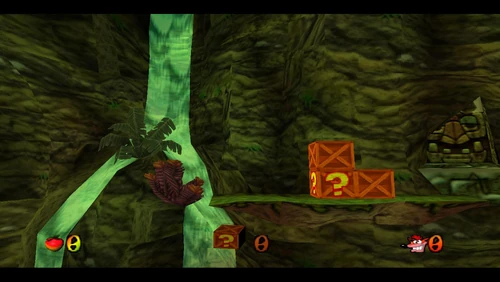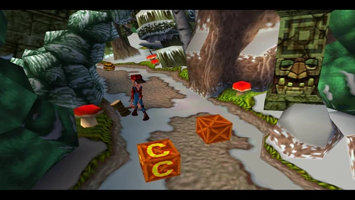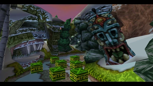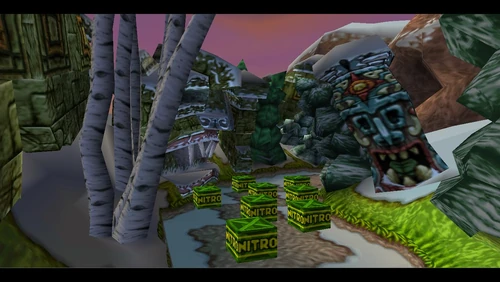 Crash can dig into the patches of magenta soil throughout the latter half of the level. There's also a secret warp area here which transports Crash to the sixth warp room and reveals the alternative route in Road to Ruin, which is accessible by jumping on the platform that's in the middle of a pit. It is occupied by a spitter plant, shortly after the death route rejoins the regular route.