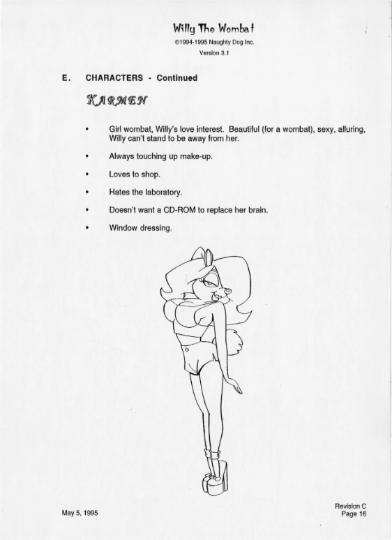 The earliest publicly-available mention of Tawna being a damsel-in-distress for Crash to rescue can be seen in a document detailing the script of an opening sequence for the first game, dated February 20, 1995, written by Joe Pearson. Originally, Karmen was created by Neo Cortex to be Willy's romantic partner, for the purpose of creating a line of "Uberwombats". Cortex would later decide to have Karmen for himself after banishing Willy from his army and castle. Karmen opposed Cortex's advances and intent of war, instead only wishing to be with Willy.[18] This same story would also appear on the May 5, 1995 edition of the production bible,[21] though Karmen's character description was inelaborate, particularly compared to those of the other characters. Her defining traits included frequently touching up her make-up, loving to shop, and hating being in Cortex's laboratory.[15]