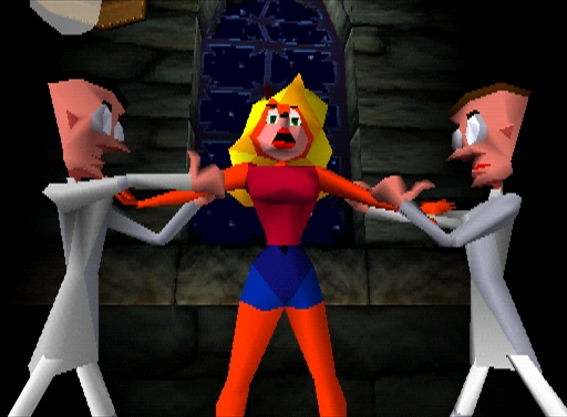 Tawna being held by two Lab Assistants in the opening sequence of Crash Bandicoot.