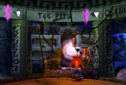 The Pits is the fourth level of the first warp room in Crash Bandicoot 2: Cortex Strikes Back and the N. Sane Trilogy remake of the second game. A jungle level which takes place at sunset, and omitting the rain and clouds from the first level, this level introduces a new type of turtle, armed with a dangerous buzz-saw on its back. It is the first level in the game to feature a split path. The crystal is on the left path, but in order to break all the crates and get the gem, the player is required to explore both paths.
