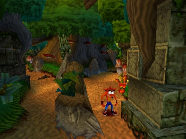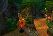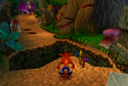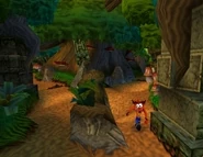 Like most jungle levels in the Crash Bandicoot series, outside of the path, the vegetation grows heartily and thick with all sorts of trees, ferns, vines, and mushrooms. This natural wall of greenery prevents the player from exiting the dirt path that leads from one warp room platform to another. The jungle featured in The Pits, Turtle Woods, and the Intro level is home to a variety of brightly colored birds, dragonflies, turtles and armadillos. The style of the ancient temple ruins in this level portrays an image of the sun quite often, leading to the belief that the ancient inhabitants of the islands revered the sun as a god, like in many ancient cultures. The bonus round takes place in what seems together be a cliff side. It is a lush area, where a waterfall runs and a thick layer of grass exists on the juts on rocky walls.